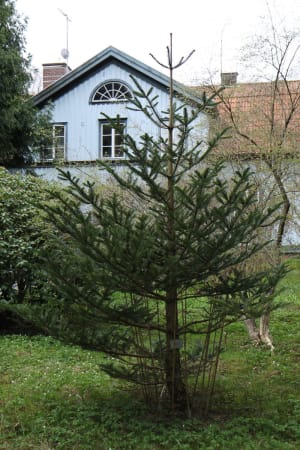 Abies kawakamii 1998-1340/1 nära Blå huset i Göteborgs botaniska trädgårds Pinetum. Notera bambupinnarna som skydd mot fejande rådjur. Foto 2017-04-15.